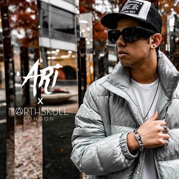 Amir can be seen layering the Atticus Skull Curb Chain Necklace in Gunmetal with the Chevron ID Tag Necklace in Silver in several of his looks.
