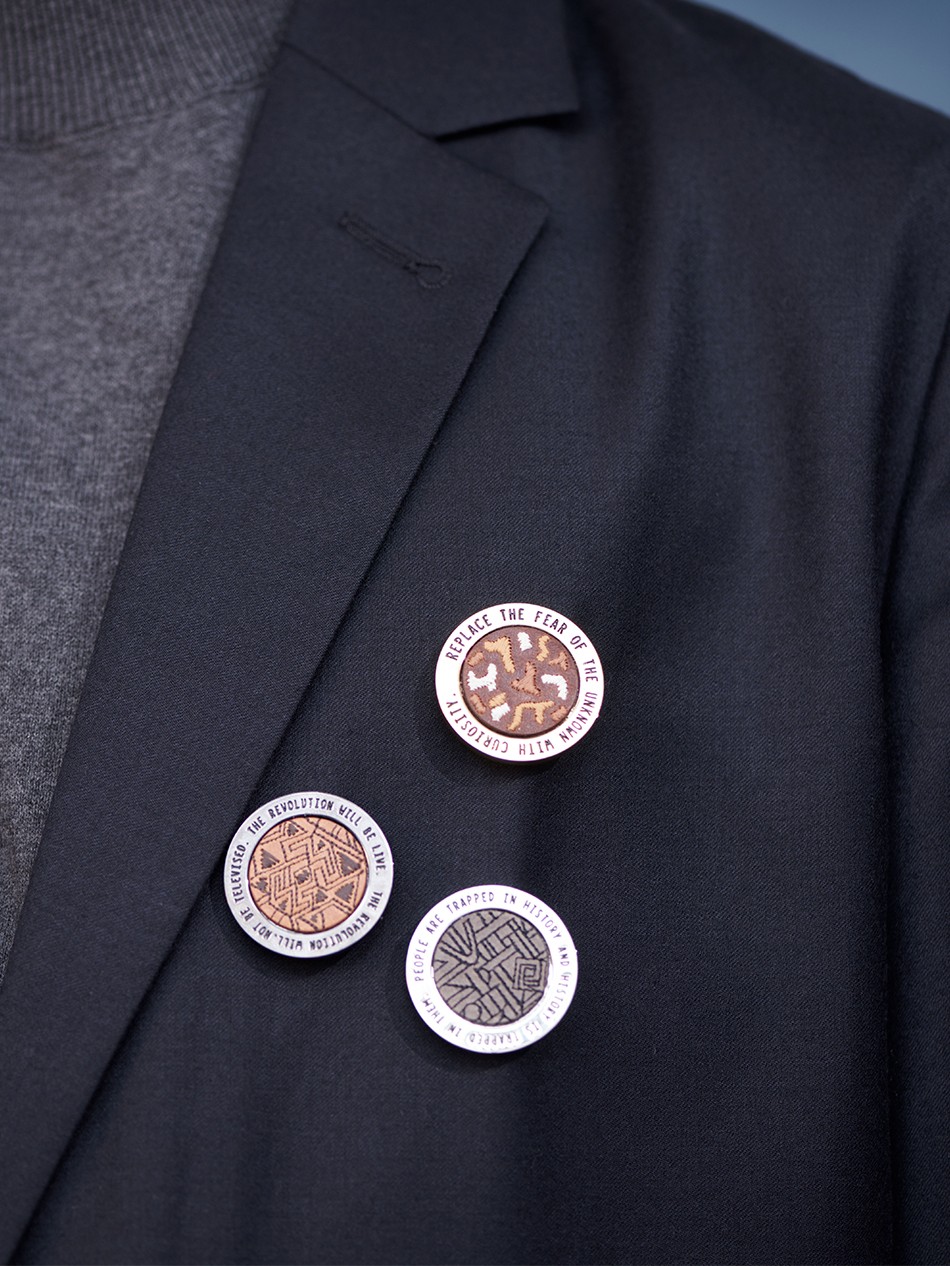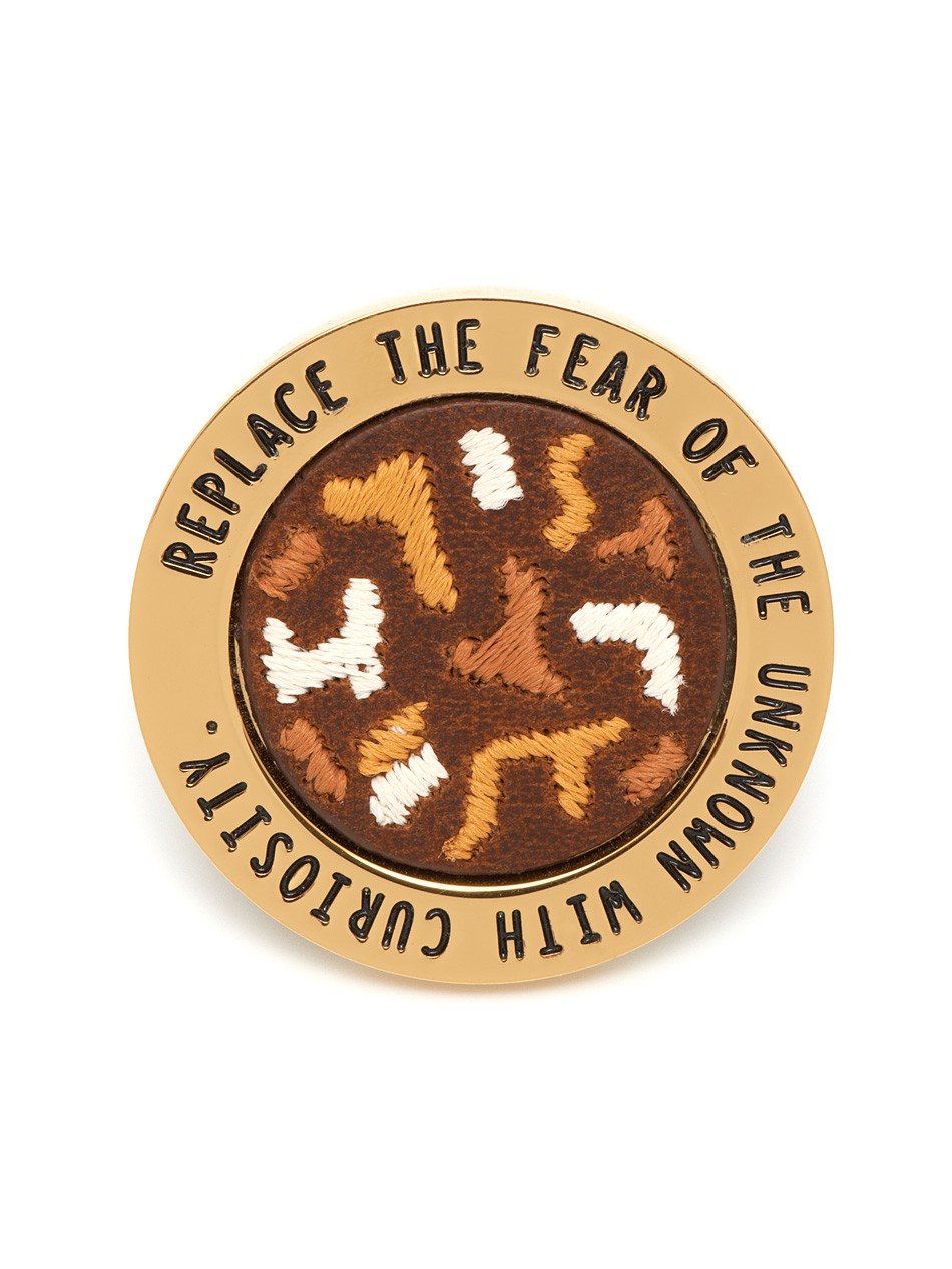 Designed with delicate embroidery in an abstract camouflage pattern and finished with an empowering quote by British philosopher Alan Watts, the Kuba Pin can be worn on outerwear, or even pinned on hats or bags, to show a stylish and individual detail.