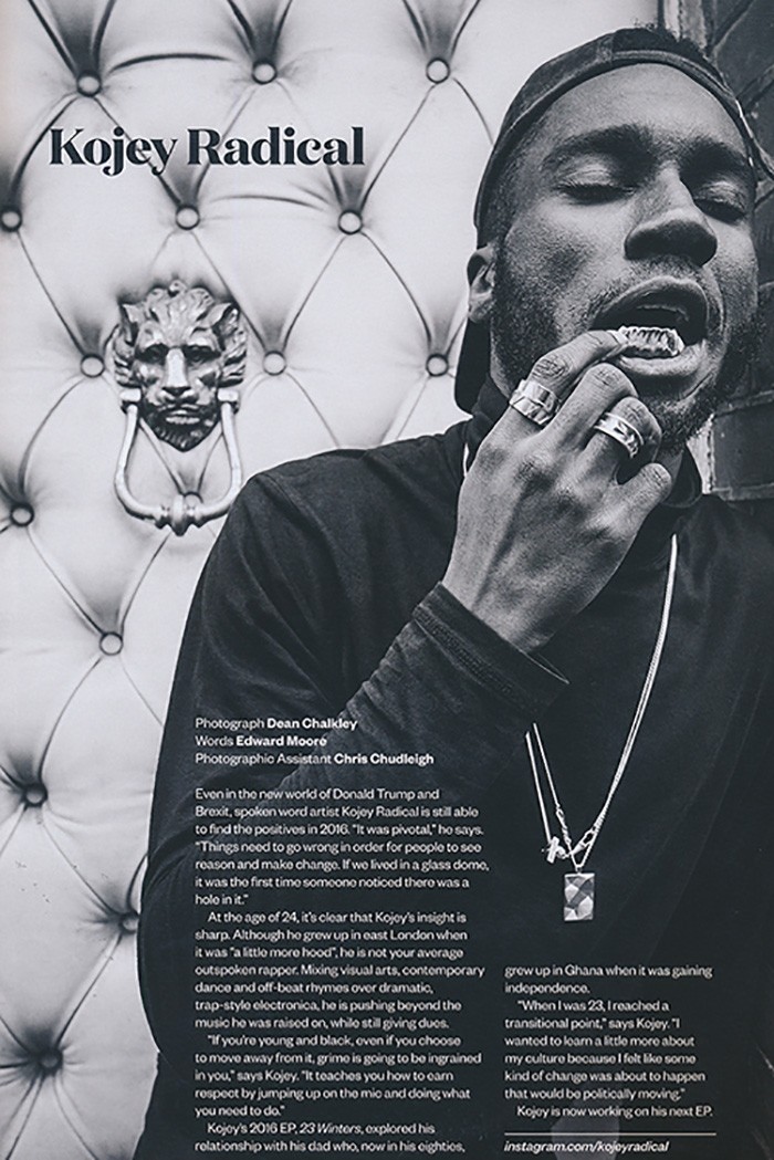 For an interview with Jocks & Nerds Magazine, spoken word artist Kojey Radical wears a selection of gold Northskull jewellery to talk about subjects that influences his music and creative endeavours. Kojey styles his jewellery by layering pieces together for a cool and individual look. For this feature he matches the Insignia Curb Necklace and the In 'n' Out Necklace together, as well as wearing the Continuity Ring and Leaf Ring on the same hand.