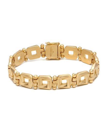 The Quadrum Chain Bracelet, Leather Tag Bangle, Petrified Wood Agate Inlay Necklace and Novum Rotating Signet Ring featured in a fashion editorial called "Mind the Bag" in the Autumn/Winter 2018 issue of Lewis magazine.