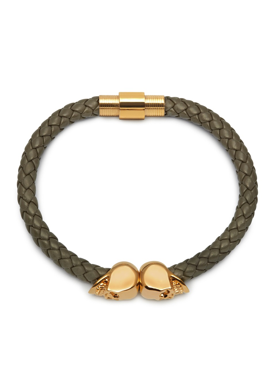Army Green Nappa Leather / Gold Twin Skull Bracelet