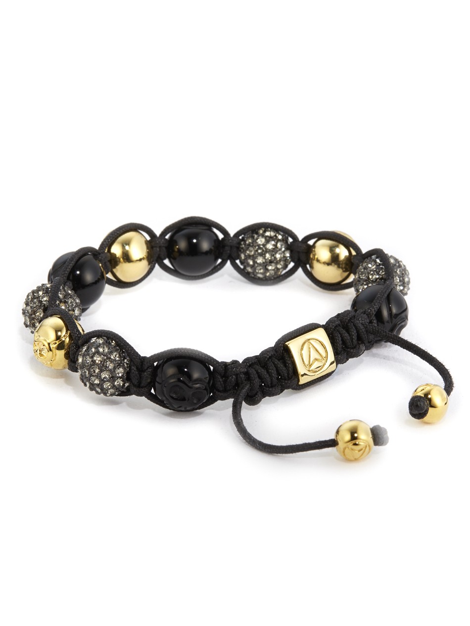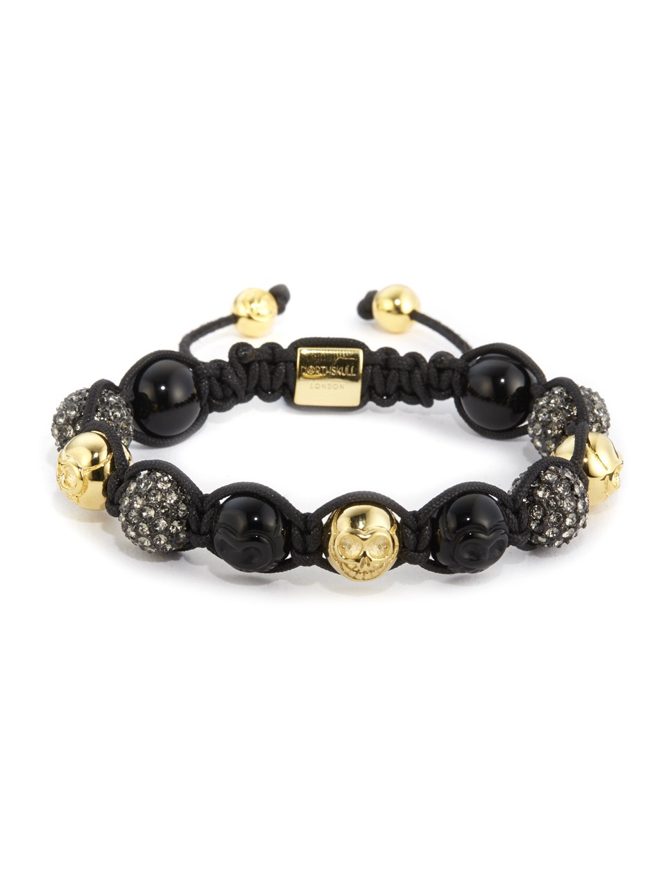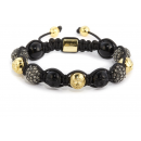A conceptual twist on a skull bracelet, this piece incorporates skulls made from black onyx and hand carved skulls with a 18kt. gold finish blended with beads encrusted with grey Swarovksi crystals to inject sparkle for luxe appeal.