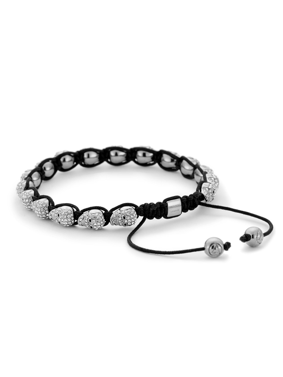 A spectacular design enhanced with Swarovski crystals, this Northskull bracelet is the epitome of modern luxury. An unforgettable accessory constructed with 17 micro skulls entwined with a black wax coated rope, this piece will add a contemporary edge to smart styles.