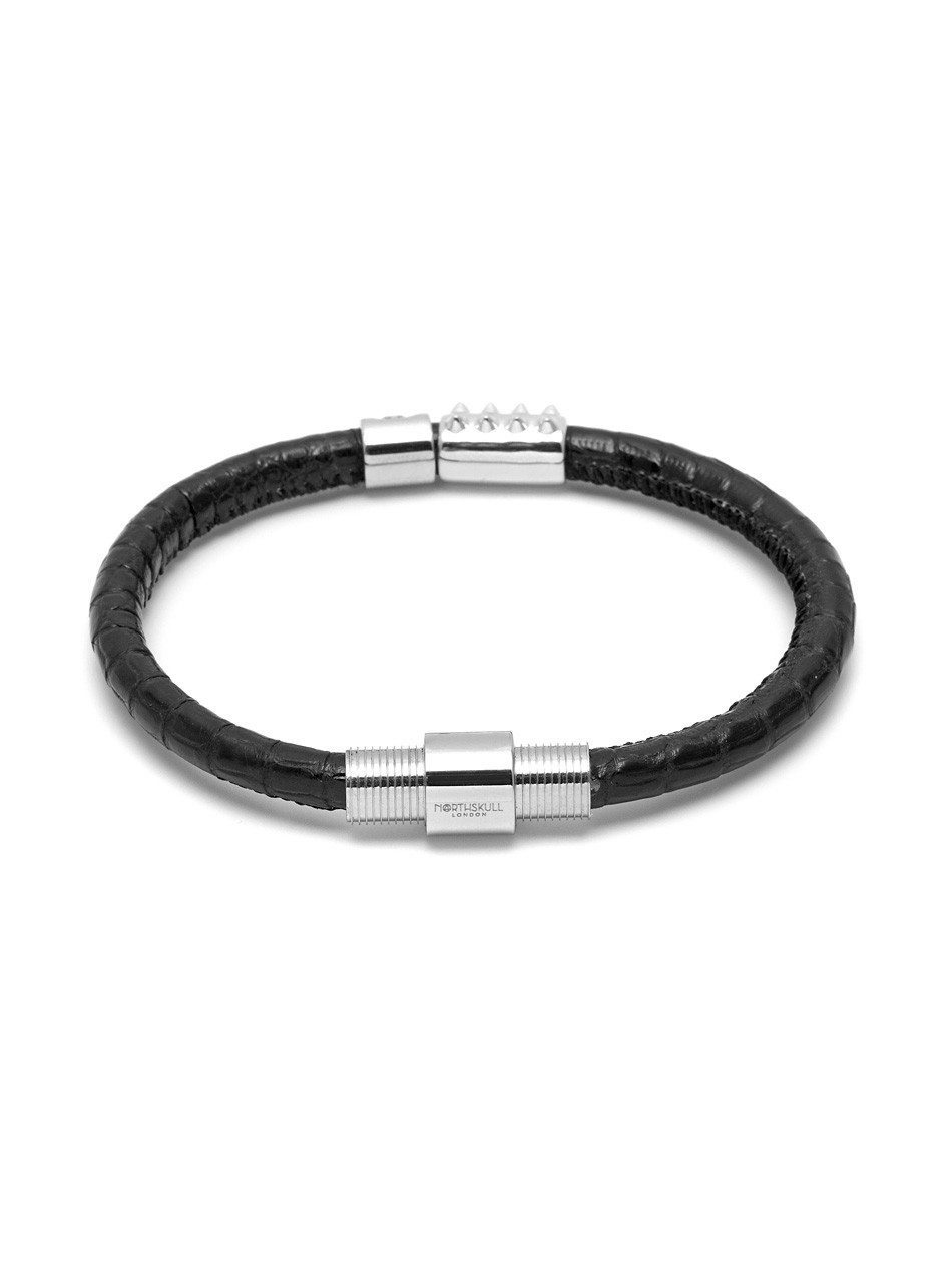 Add an edge to your look with this luxurious Lizard Leather Bracelet. Constructed with the exotic skin and decorated with silver elements unique to Northskull, this leather bracelet will bring refinement to any ensemble.