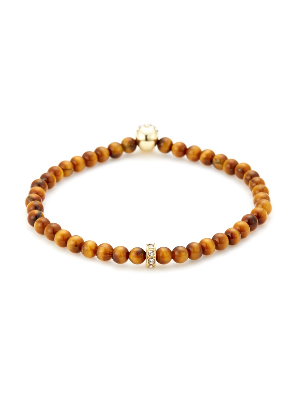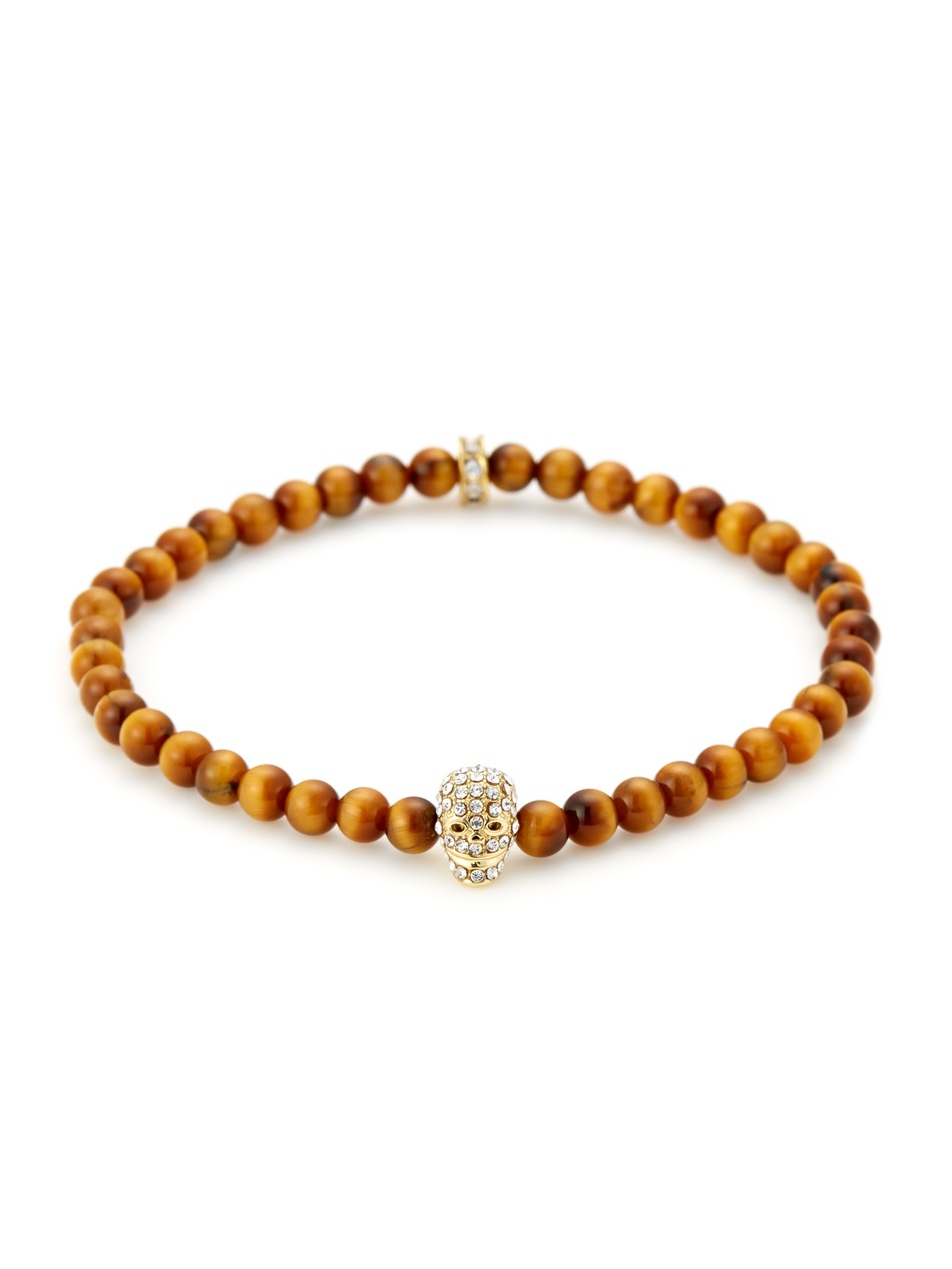 Update your accessories collection with this luxurious bracelet. The skull charm bracelet is a firm favourite, and we have reinvented this classic style by utilising micro yellow tiger eye stones to match with a micro skull finished with 18kt. gold. Create a cool style code by layering this bracelet with our Black Onyx/Silver & Clear Crystal Micro Skull Bracelet.