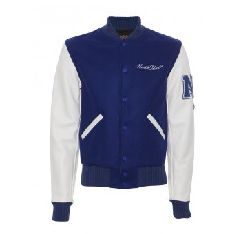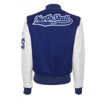 An iconic letterman jacket, The high school classic features genuine cowhide leather sleeves and pocket trim, 100% wool body, Italic Northskull cheynelle patch to the back of jacket and chenille NS logo to left arm. NorthSkull Italic logo to left breast. Snap buttons.Fully lined. Ribbed Cuffs and Hem. Beautiful embellishments and details make this item a limited edition collectors piece.