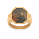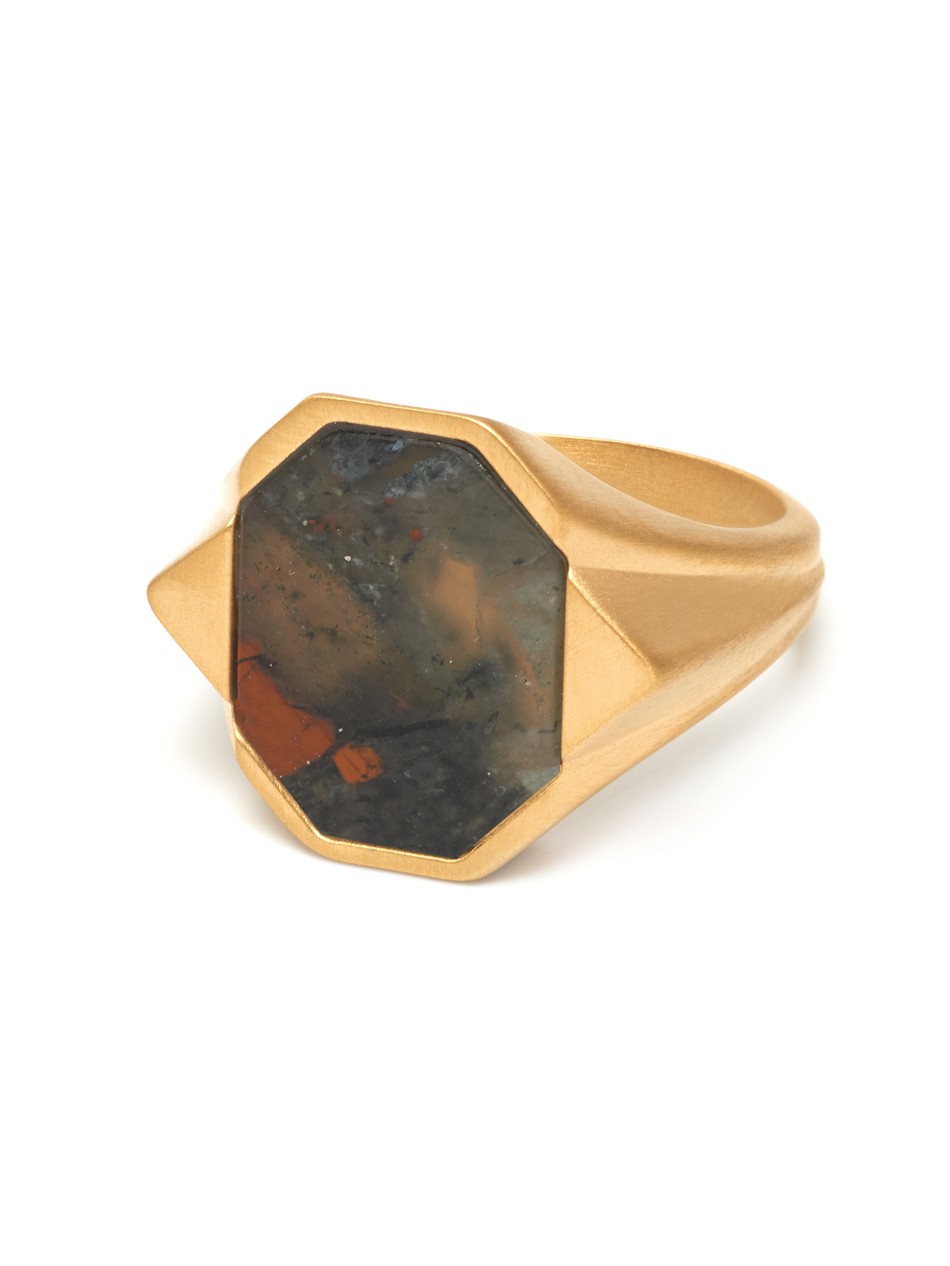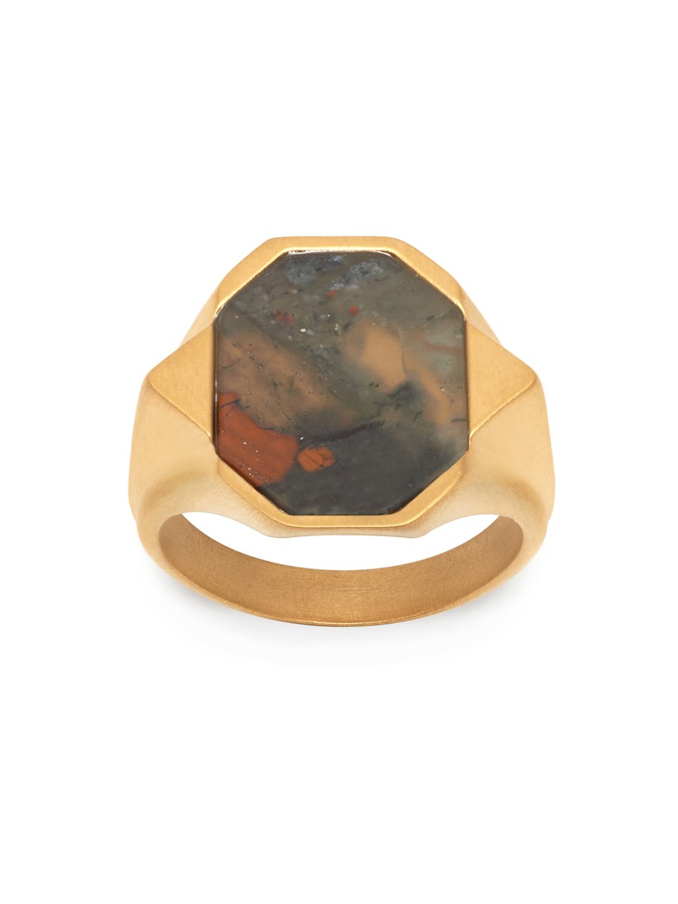 The Agbara Ring is a symbol of contemporary masculinity. With the complementary combination of natural bloodstone and the brushed gold finish of the ring, this Northskull accessory presents a luxurious option to rejuvenate sleek tailoring with a stylish design for the new season.