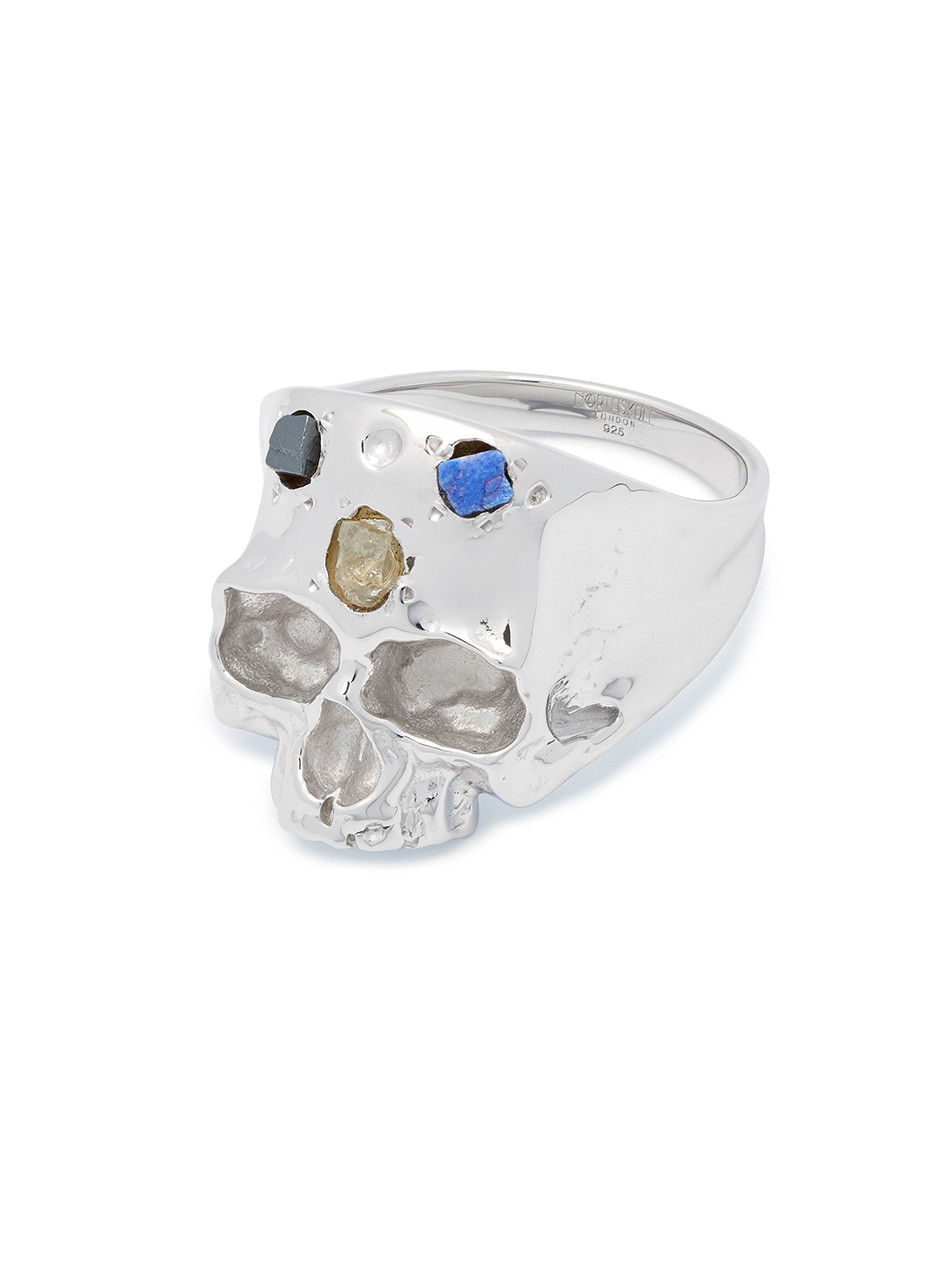 Crafted in polished sterling silver, this statement ring features an anatomical skull set with raw, uncut gemstones — including lapis lazuli, hematite, and citrine. Each stone’s natural form creates a bold contrast of texture and colour, embodying Northskull’s signature fusion of refinement and edge.