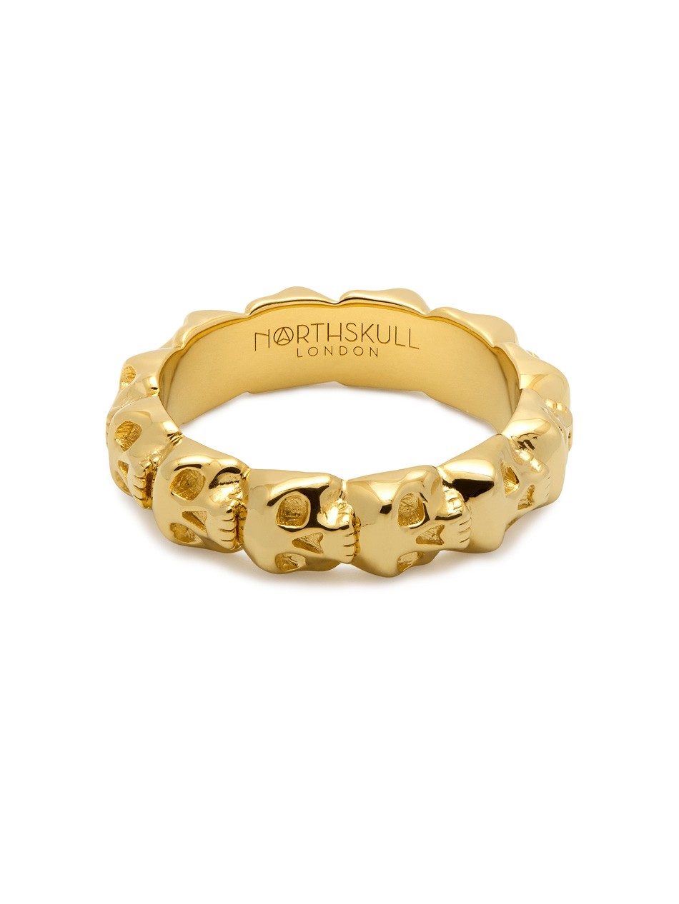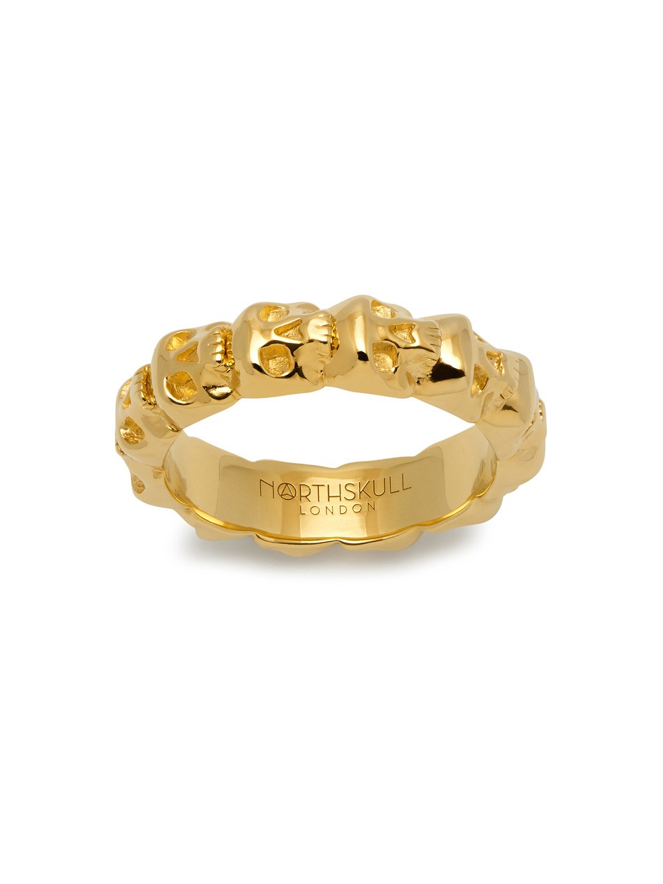 Continuing the design language that Northskull is known for, this luxurious gold ring is a symbol of contemporary masculinity. Constructed with a high level of jewellery expertise, the Medius Skull Band Ring is a style classic embellished with skulls infused with the distinctive Northskull aesthetic.