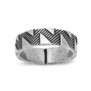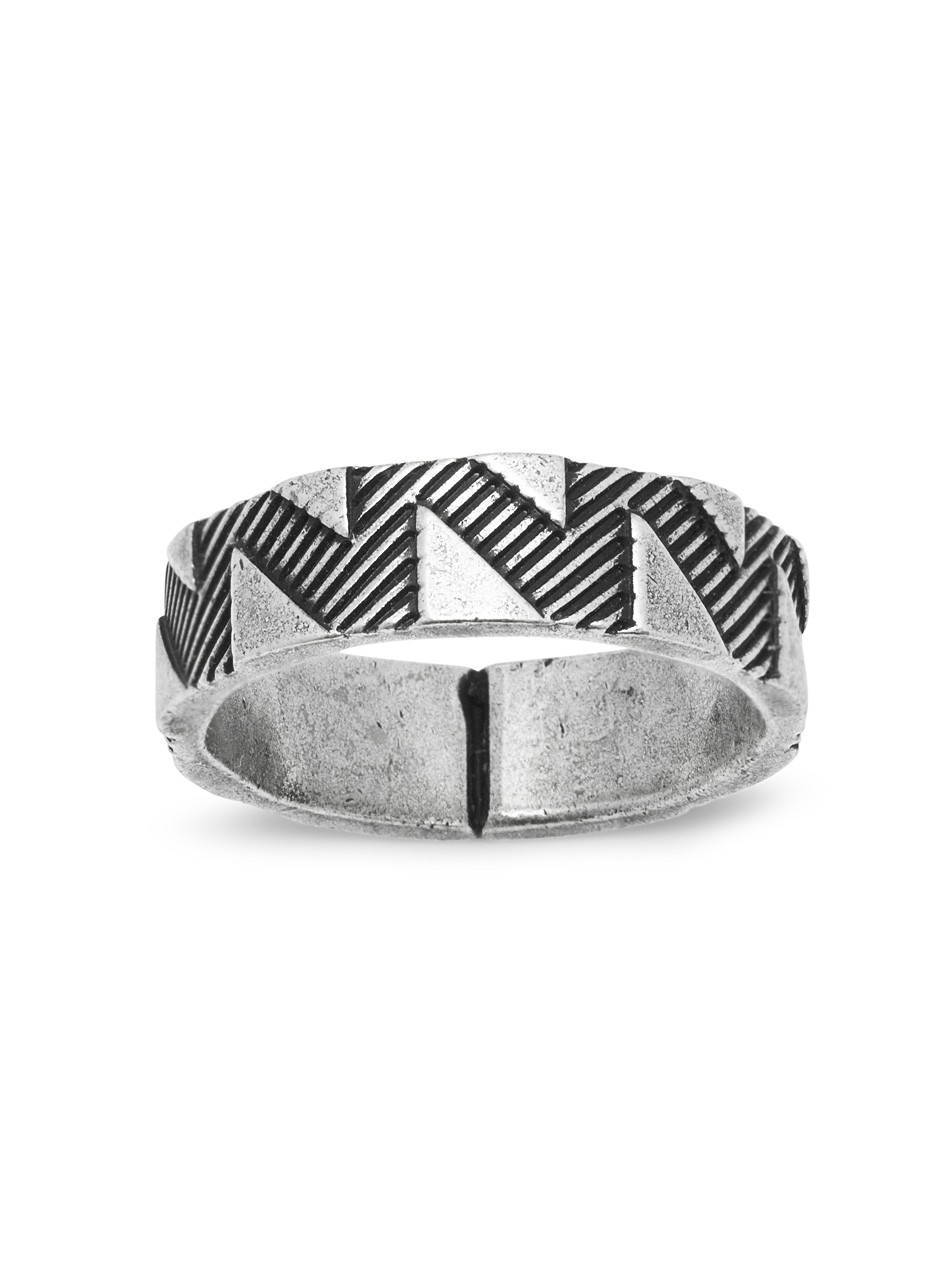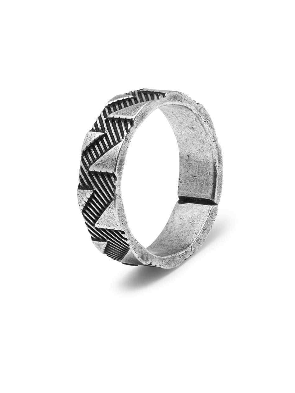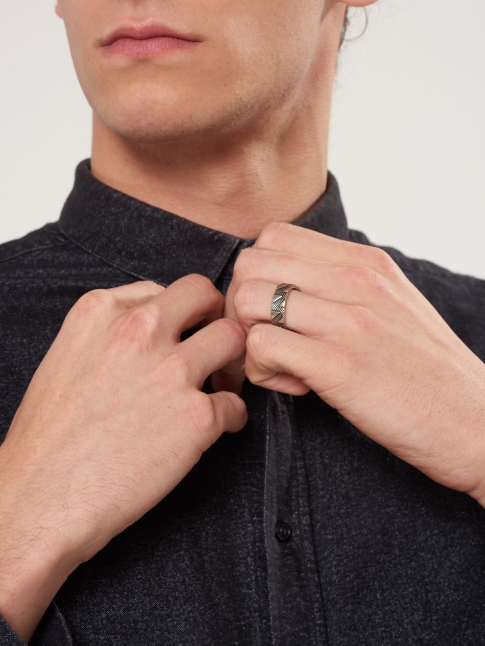 Accessorise contemporary outfits with this brilliant Northskull ring. Line etchings within a structured pattern resulting in small panels of aged silver triangles across the band makes the Shadowplay Ring an exciting piece of jewellery to match cool tailoring.