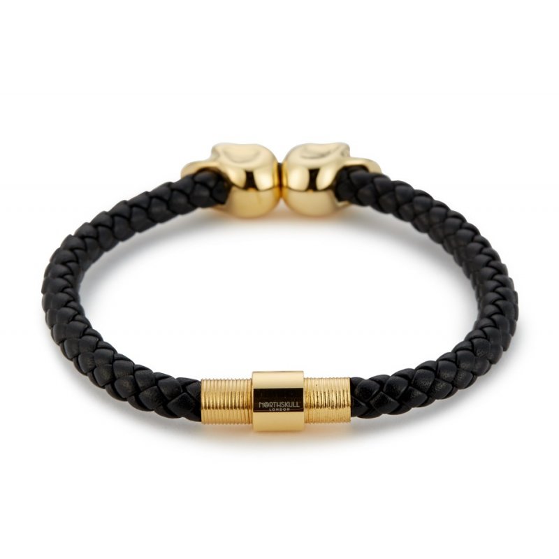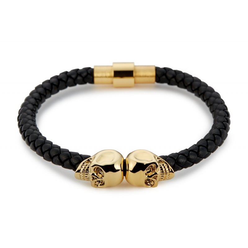 Black Nappa Leather / Gold Twin Skull Bracelet