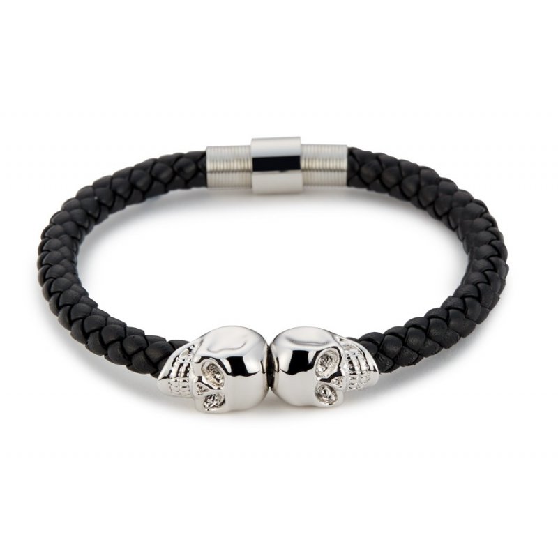 Black Nappa Leather / Silver Twin Skull Bracelet