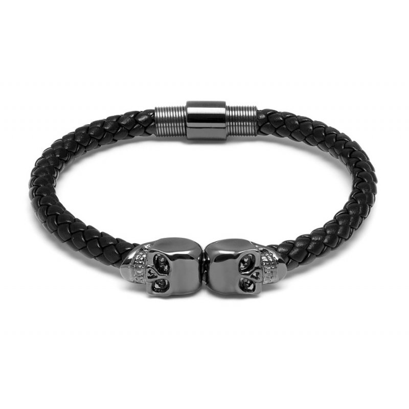 Black Nappa Leather / Gunmetal Twin Skull Bracelet