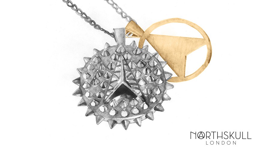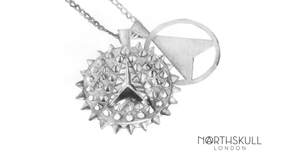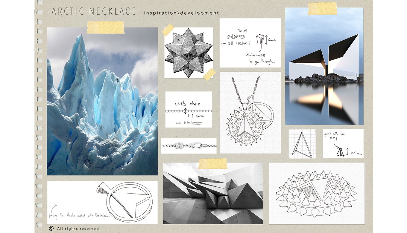 Using moodboard images of the Arctic as a starting point to bringing the Arctic necklace to life, we looked at the spectacular formations of the ice that resembled spikes to incorporate an architectural detail to the necklace. To refine this feature and to replicate the radiance seen on ice when light hits the element, we incorporated a structured approach for the spikes on the necklace, using 3D geometric shapes as a reference. Finally, to add a distinctive Northskull twist on the Artic necklace, the Northskull emblem was integrated into the piece along with an arrow cut out medal to create a striking symbol for a luxe finish.