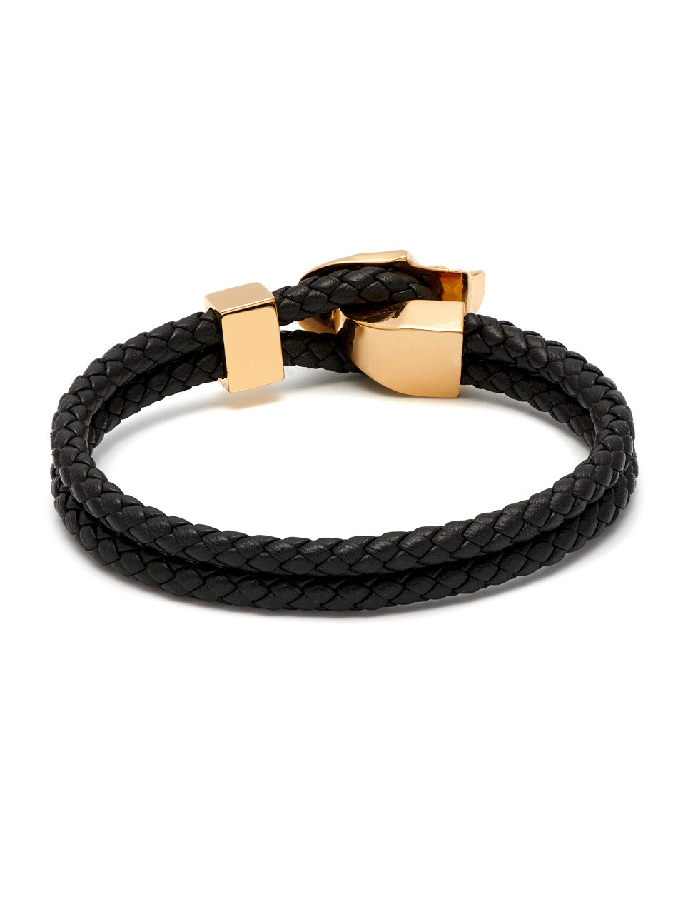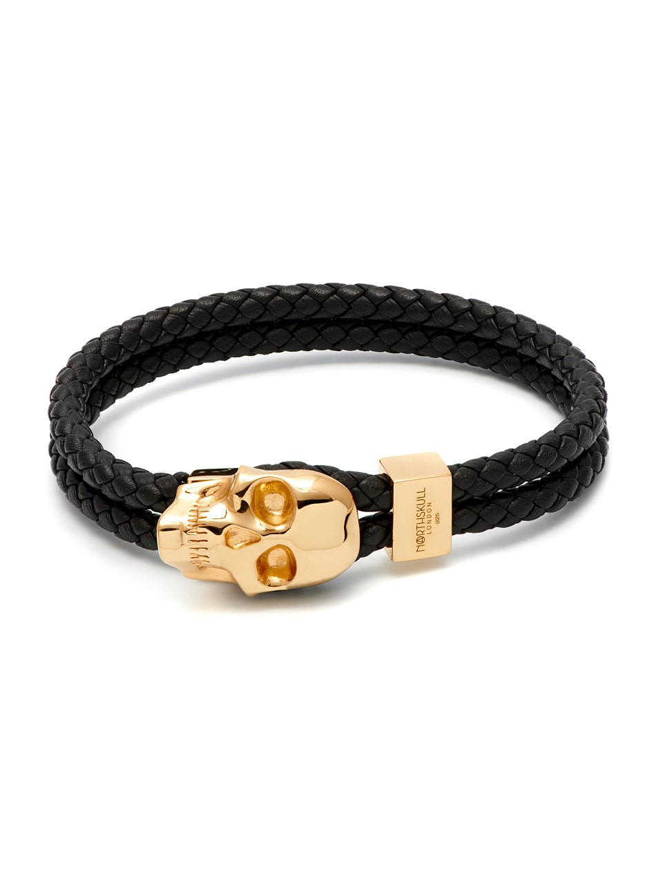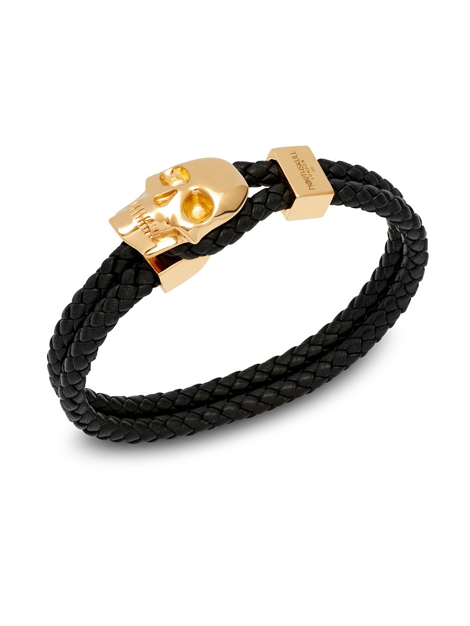 Designed with a forward-thinking vision, this Northskull accessory is a modern take on a skull leather bracelet. Crafted with braided leather straps that loop on one end through gold hardware and used as a clasp to fasten the bracelet across the skull, this innovative and stylish bracelet will add a unique feature to casual dressing.