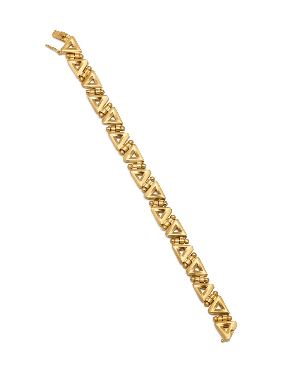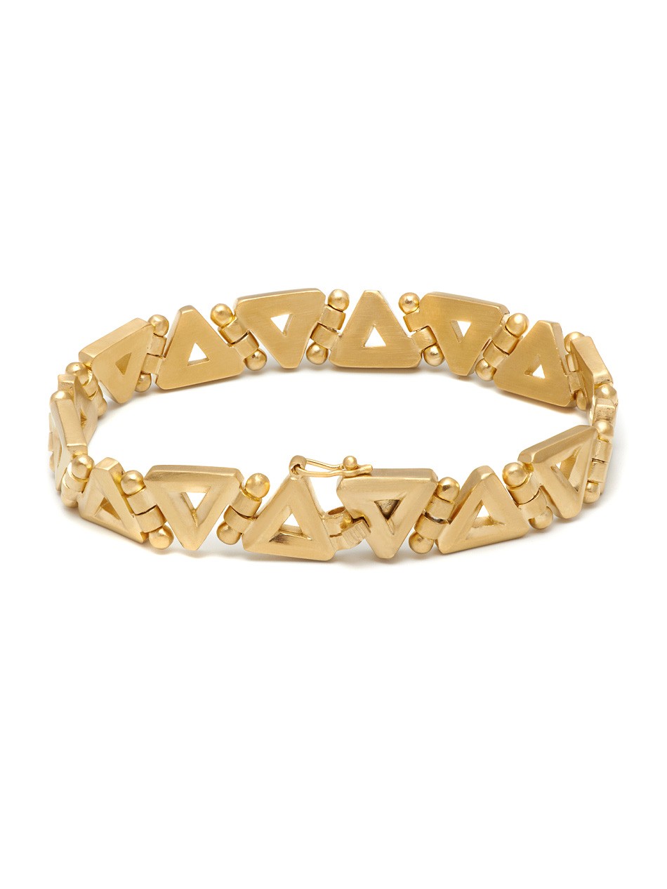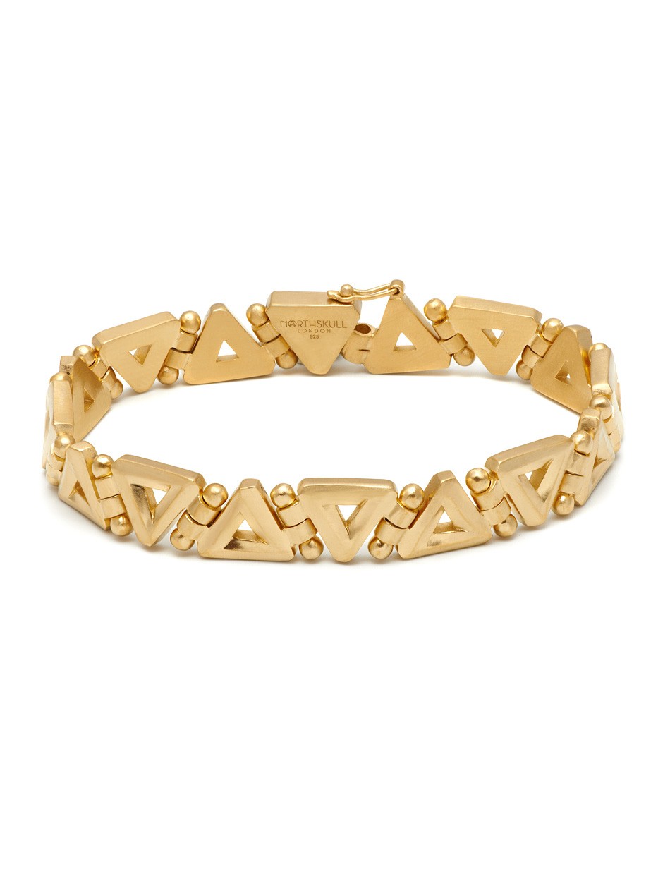Complement stylish dressing with an accessory designed with intricate embellishments. Constructed with triangular elements in gold vermeil in a repetitive pattern, the Trigonum Chain Bracelet is the answer to your sartorial dilemma.
